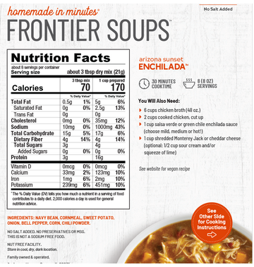 Arizona Sunset Enchilada Soup has a bold southwestern flavor profile that features dehydrated white beans, diced peppers and sweet potato, and warm chili seasonings. Add chicken and salsa verde for an authentic Mexican meal, gluten free and ready in just 30 minutes.